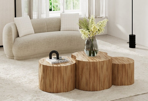 Une table basse ronde en bout de canapé ou en chevet dans la chambre est du plus bel effet. Un mix entre des petites tables que vous allez coordonner, table d’appoint et table de salon en bois de la même collection, peut rappeler l’esprit des tables gigognes qu’on aurait dissociées et placées en différents points de la pièce pour lui donner du swing.